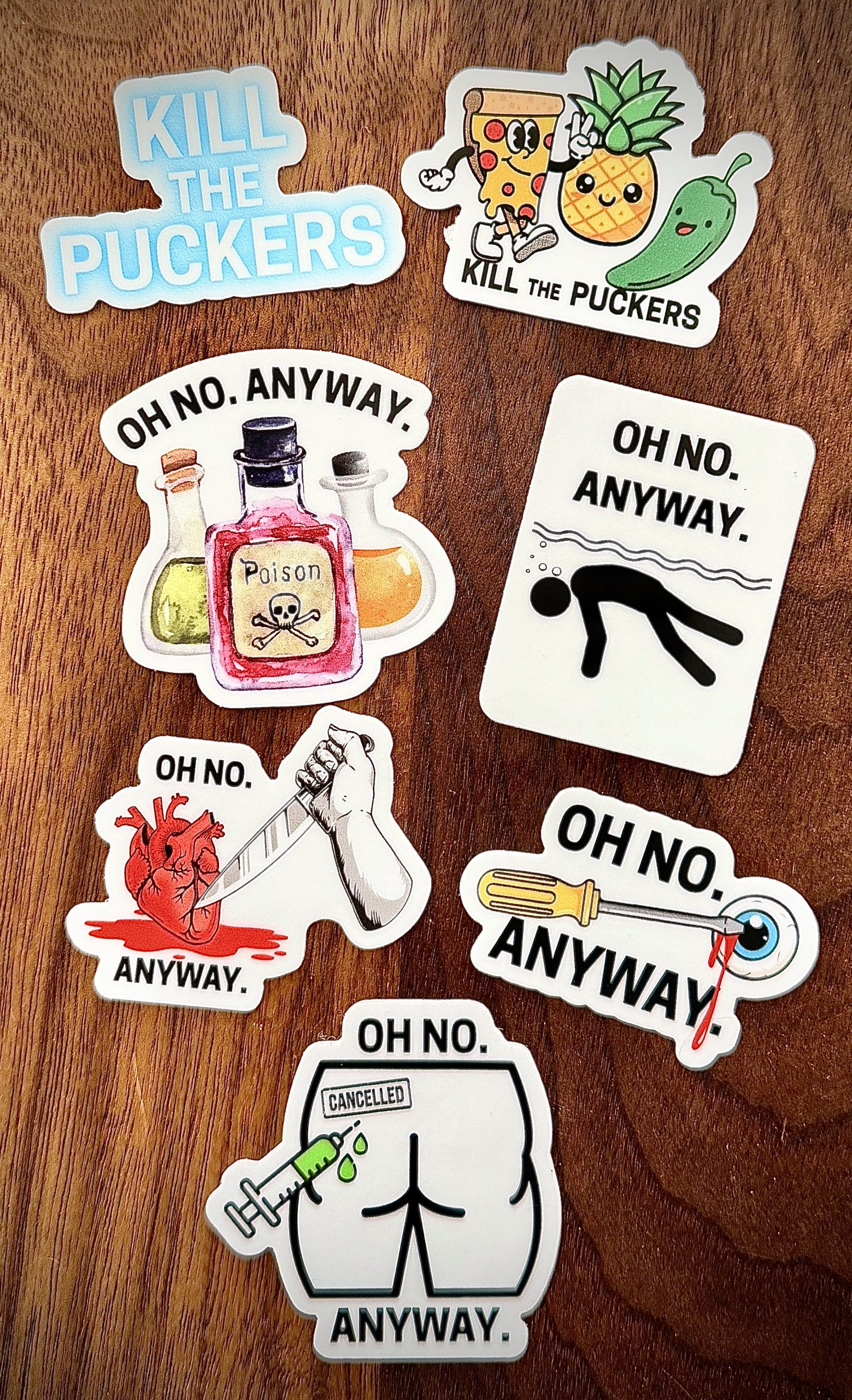 Seven stickers for the price of six! Love revenge lit? Want to share vigilante justice with the world? Enjoy some fun vengeance (and romantic pizza options) any time with these stickers specially designed for Kill the Puckers! Each sticker is approximately 2x2in. (5x5cm).
